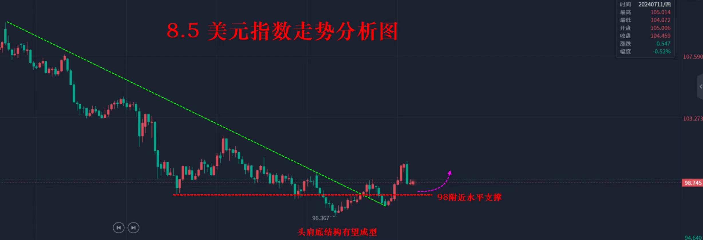 第二:4小时,形态上,震荡向下运行。走的是阶梯下跌;短线上虽然止跌,但是4小时还没完全的反转向上;随机指标和MACD指标双线钝化向上,力度有限;强压位置在98.7附近位置,下面支撑位置在止跌位97.6附近位置;